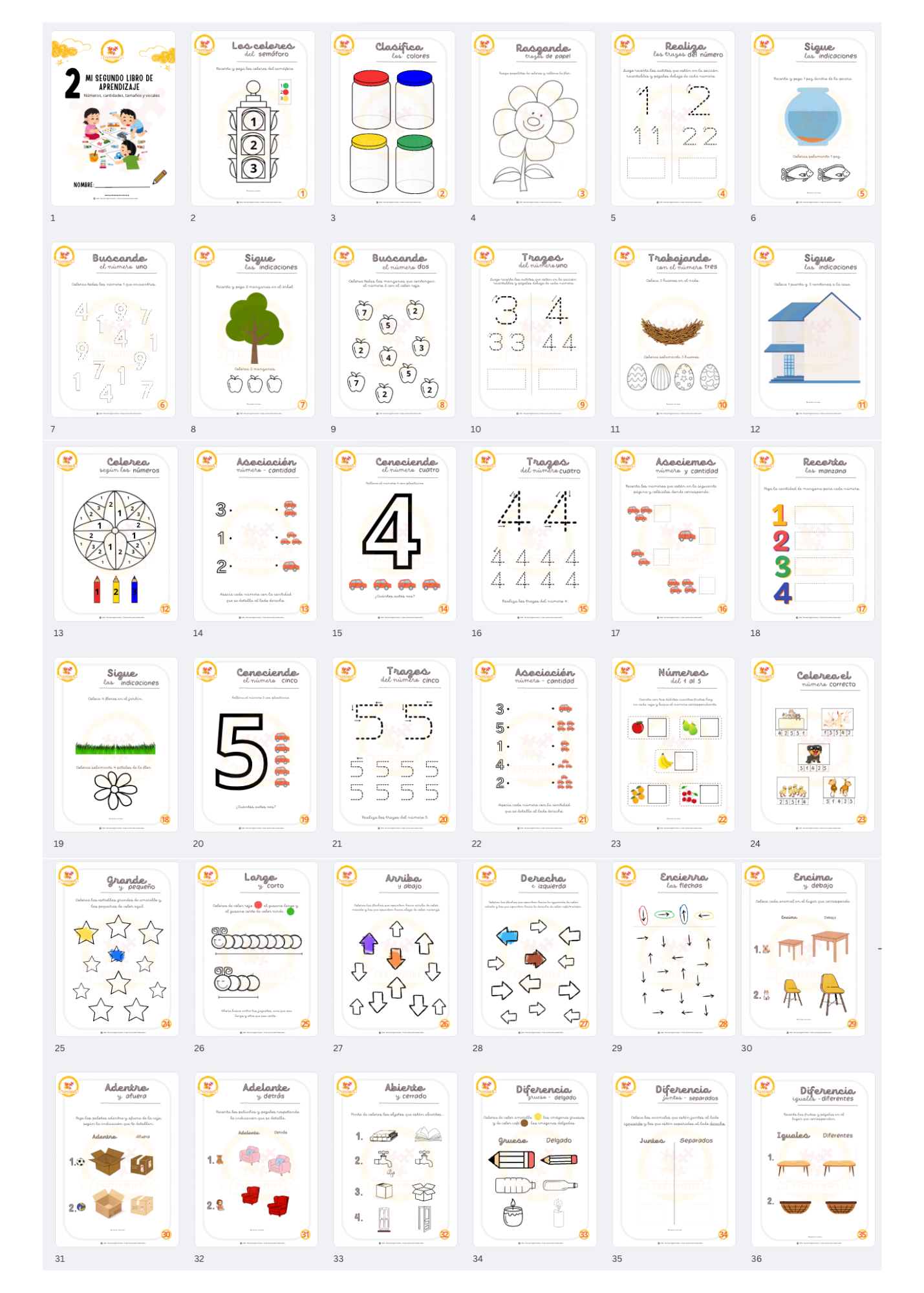 Este libro esta diseñado para trabajar números del 1 al 5, reconocerlos y asociarlos a cantidades. Trabajamos trazos con distintos materiales y con un marcador, clasificación de las figuras geométricas (formas y tamaños), las vocales y el sonido inicial de cada una de ellas y ubicaciones en el espacio de diferentes materiales.